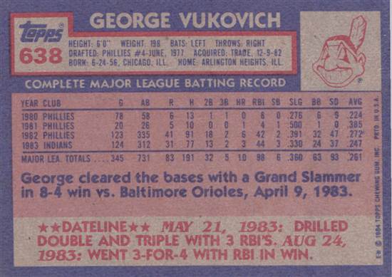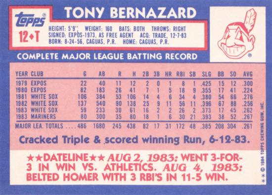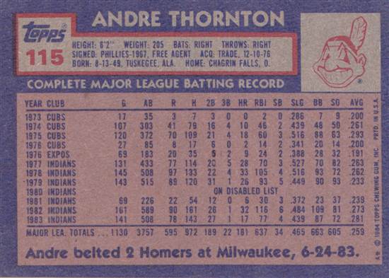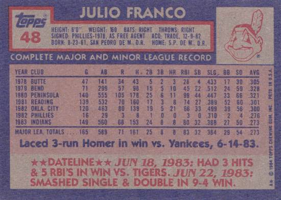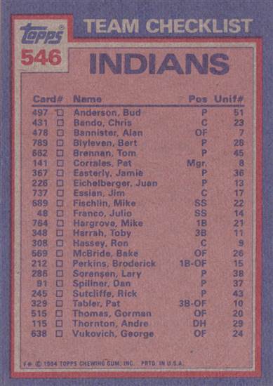 1984 Topps Cleveland Indians Team Set #48 Julio Franco#48 Julio Franco (b)#91 Dan Spillner#91 Dan Spillner (b)#115 Andre Thornton#115 Andre Thornton (b)#141 Pat Corrales#141 Pat Corrales (b)#212 Brokerick Perkins#212 Brokerick Perkins (b)#226 Juan Eichelberger#226 Juan Eichelberger (b)#245 Rick Sutcliffe#245 Rick Sutcliffe (b)#286 Lary Sorensen#286 Lary Sorensen (b)#308 Ron Hassey#308 Ron Hassey (b)#329 Pat Tabler#329 Pat Tabler (b)#348 Toby Harrah#348 Toby Harrah (b)#367 Jamie Easterly#367 Jamie Easterly (b)#431 Chris Bando#431 Chris Bando (b)#478 Alan Bannister#478 Alan Bannister (b)#497 Bud Anderson#497 Bud Anderson (b)#515 Gorman Thomas#515 Gorman Thomas (b)#546 Team Checklist#546 Team Checklist (b)#569 Bake McBride#569 Bake McBride (b)#638 George Vukovich#638 George Vukovich (b)#662 Tom Brennan#662 Tom Brennan (b)#689 Mike Fischlin#689 Mike Fischlin (b)#737 Jim Essian#737 Jim Essian (b)#764 Mike Hargrove#764 Mike Hargrove (b)#789 Bert Blyleven#789 Bert Blyleven (b)#T2 Luis Aponte#T2 Luis Aponte (b)#T12 Tony Bernazard#T12 Tony Bernazard (b)#T20 Brett Bulter#T20 Brett Bulter (b)#T47 Mel Hall#T47 Mel Hall (b)#T55 Brook Jacoby#T55 Brook Jacoby (b)#T56 Mike Jeffcoat#T56 Mike Jeffcoat (b)#T125 Tom Waddell#T125 Tom Waddell (b)