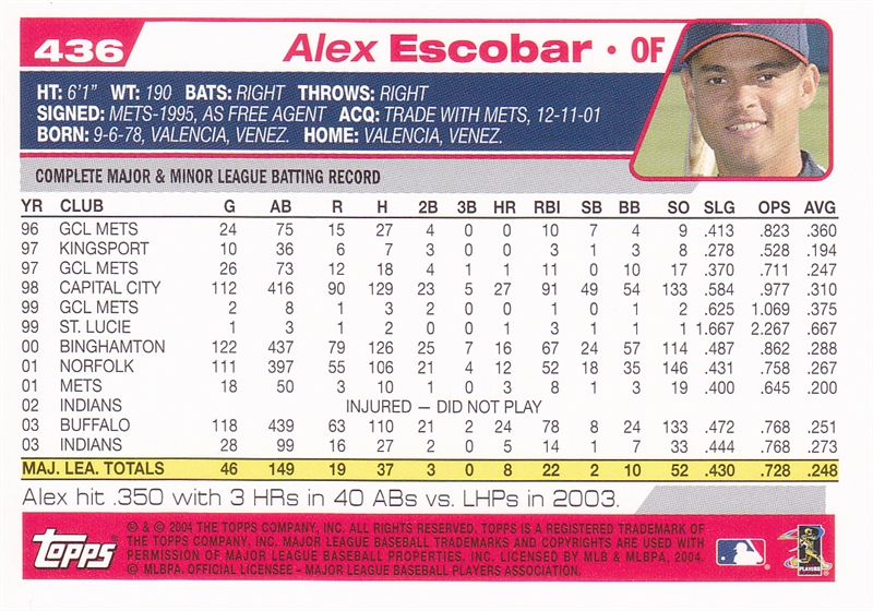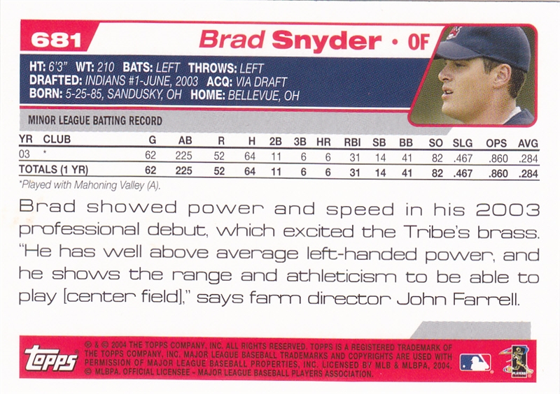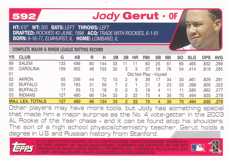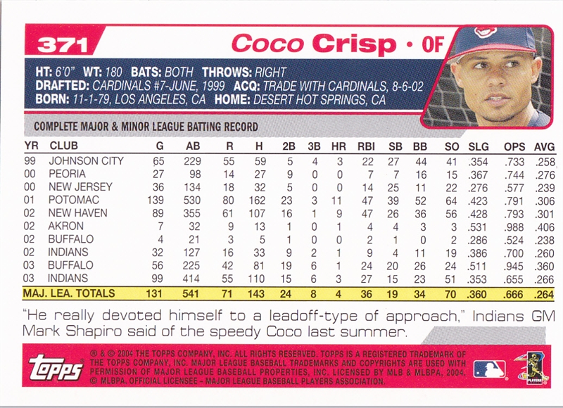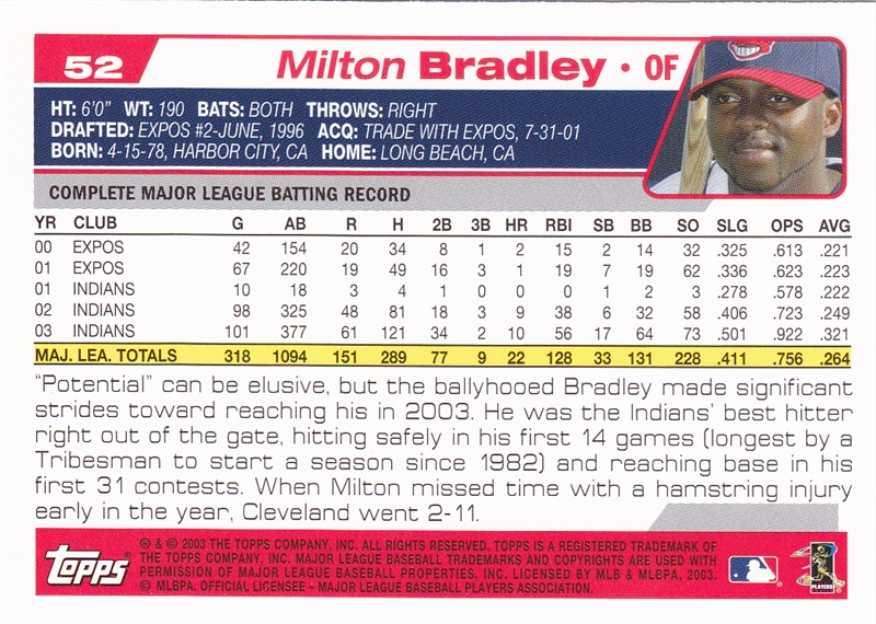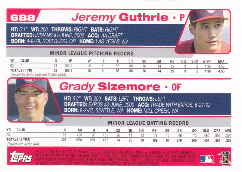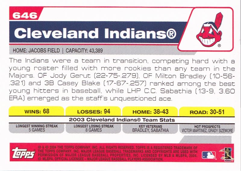 2004 Topps Cleveland Indians Team Set #52 Milton Bradley#52 Milton Bradley (b)#86 Matt Lawton#86 Matt Lawton (b)#128 Danys Baez#128 Danys Baez (b)#143 Omar Vizquel#143 Omar Vizquel (b)#168 Brandon Phillips#168 Brandon Phillips (b)#235 C.C. Sabathia#235 C.C. Sabathia (b)#275 Eric Wedge MGR#275 Eric Wedge MGR (b)#320 Rodney Choy Foo#320 Rodney Choy Foo FY (b)#367 Jody Gerut AS#367 Jody Gerut AS (b)#371 Coco Crisp#371 Coco Crisp (b)#383 Cliff Lee#383 Cliff Lee (b)#436 Alex Escobar#436 Alex Escobar (b)#458 Ryan Ludwick#458 Ryan Ludwick (b)#483 Jake Westbrook#483 Jake Westbrook (b)#504 Jhonny Peralta#504 Jhonny Peralta (b)#511 Billy Traber#511 Billy Traber (b)#539 Ben Broussard#539 Ben Broussard (b)#545 Travis Hafner#545 Travis Hafner (b)#568 Jason Davis#568 Jason Davis (b)#577 Casey Blake#577 Casey Blake (b)#592 Jody Gerut#592 Jody Gerut (b)#609 Josh Bard#609 Josh Bard (b)#646 Indians Team Card#646 Indians Team Card (b)#681 Brad Snyder#681 Brad Snyder (b)#688 Grady Sizemore Jeremy Guthrie#688 Grady Sizemore Jeremy Guthrie (b)#T26 Ronnie Belliard#T26 Ronnie Belliard (b)#T116 Kazuhito Tadano#T116 Kazuhito Tadano (b)#T124 Fausto Carmona#T124 Fausto Carmona (b)#T198 Ivan Ochoa#T198 Ivan Ochoa (b)#T199 David Wallace#T199 David Wallace FY (b)