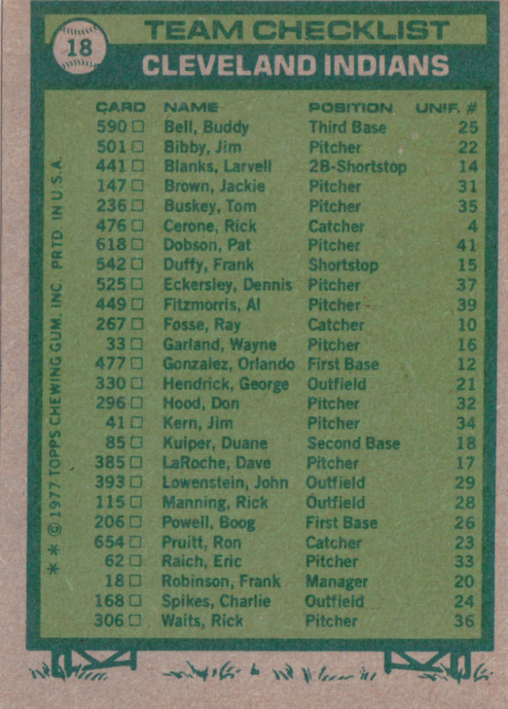 1977 Topps Cleveland Indians Team Set Posted on June 23, 2019 • Posted Under • No Comments #18 Cleveland Indians#18 Cleveland Indians (b)#33 Wayne Garland#33 Wayne Garland (b)#41 Jim Kern#41 Jim Kern (b)#62 Eric Raich#62 Eric Raich (b)#85 Duane Kuiper#85 Duane Kuiper (b)#115 Rick Manning#115 Rick Manning (b)#147 Jackie Brown#147 Jackie Brown (b)#168 Charlie Spikes#168 Charlie Spikes (b)#206 Boog Powell#206 Boog Powell (b)#236 Tom Buskey#236 Tom Buskey (b)#267 Ray Fosse#267 Ray Fosse (b)#296 Don Hood#296 Don Hood (b)#306 Rick Waits#306 Rick Waits (b)#330 George Hendrick#330 George Hendrick (b)#385 Dave LaRoche#385 Dave LaRoche (b)#393 John Lowenstein#393 John Lowenstein (b)#441 Larvell Blanks#441 Larvell Blanks (b)#449 Al Fitzmorris#449 Al Fitzmorris (b)#476 Rookie Catchers#476 Rookie Catchers (b)#477 Rookie Infielders#477 Rookie Infielders (b)#501 Jim Bibby#501 Jim Bibby (b)#525 Dennis Eckersley#525 Dennis Eckersley (b)#542 Frank Duffy#542 Frank Duffy (b)#590 Buddy Bell#590 Buddy Bell (b)#618 Pat Dobson#618 Pat Dobson (b)#654 Ron Pruitt#654 Ron Pruitt (b)