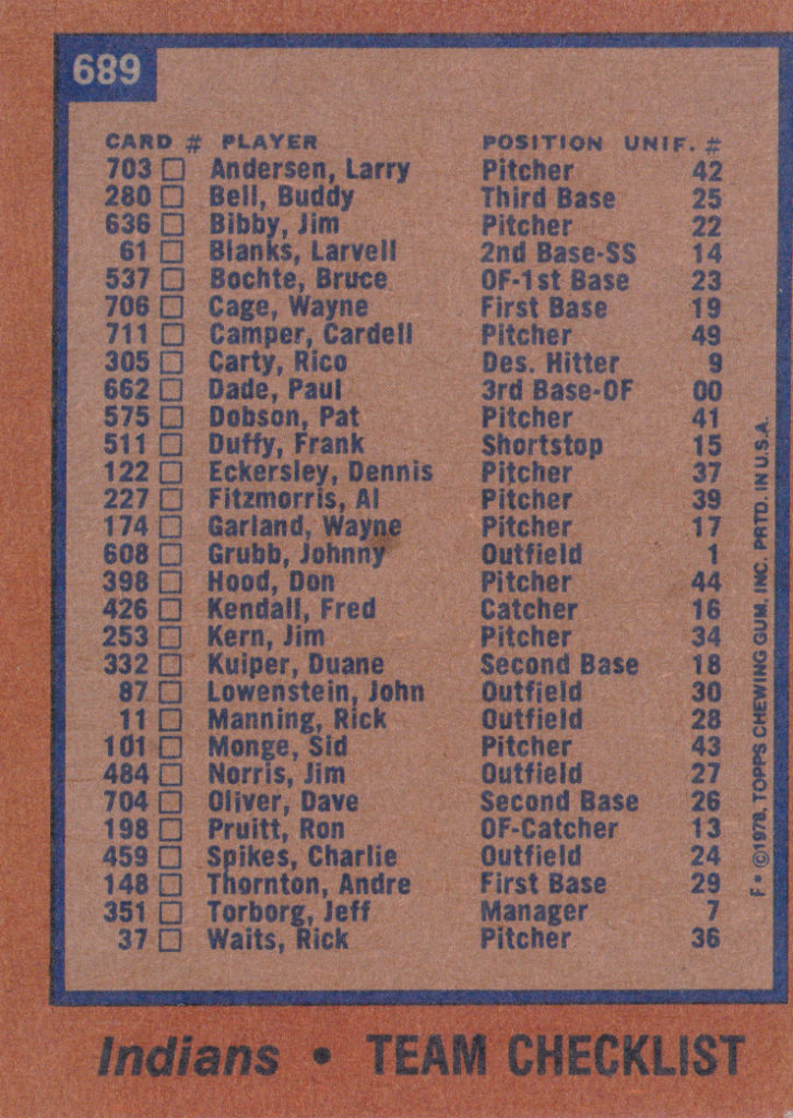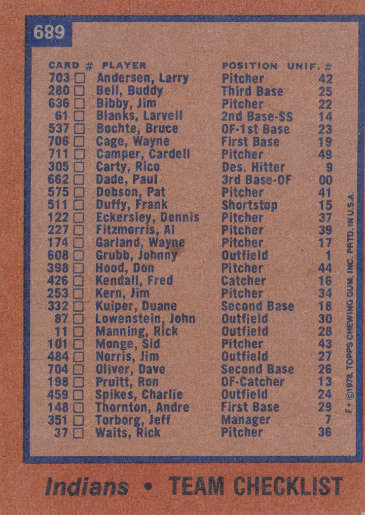 1978 Cleveland Indians Topps Team Set Posted on June 23, 2019 • Posted Under • No Comments #11 Rick Manning#11 Rick Manning (b)#37 Rick Waits#37 Rick Waits (b)#61 Larvell Banks#61 Larvell Banks (b)#87 John Lowenstein#87 John Lowenstein (b)#101 Sid Monge#101 Sid Monge (b)#122 Dennis Eckersley#122 Dennis Eckersley (b)#148 Andre Thornton#148 Andre Thornton (b)#174 Wayne Garland#174 Wayne Garland (b)#194 Ron Pruitt#194 Ron Pruitt (b)#227 Al Fitzmorris#227 Al Fitzmorris (b)#253 Jim Kern#253 Jim Kern (b)#280 Buddy Bell#280 Buddy Bell (b)#305 Rico Carty#305 Rico Carty (b)#332 Duane Kuiper#332 Duane Kuiper (b)#351 Jeff Torborg#351 Jeff Torborg (b)#398 Don Hood#398 Don Hood (b)#426 Fred Kendall#426 Fred Kendall (b)#459 Charlie Spikes#459 Charlie Spikes (b)#484 Jim Norris#484 Jim Norris (b)#511 Frank Duffy#511 Frank Duffy (b)#537 Bruce Bochte#537 Bruce Bochte (b)#575 Pat Dobson#575 Pat Dobson (b)#608 Johnny Grubb#608 Johnny Grubb (b)#636 Jim Bibby#636 Jim Bibby (b)#662 Paul Dade#662 Paul Dade (b)#689 Team Checklist#689 Team Checklist (b)#703 Rookie Pitchers#703 Rookie Pitchers (b)#704 Rookie 2nd Baseman#704 Rookie 2nd Baseman (b)#706 Rookie 1st Baseman#706 Rookie 1st Basemans (b)#711 Rookie Pitchers#711 Rookie Pitchers (b)
