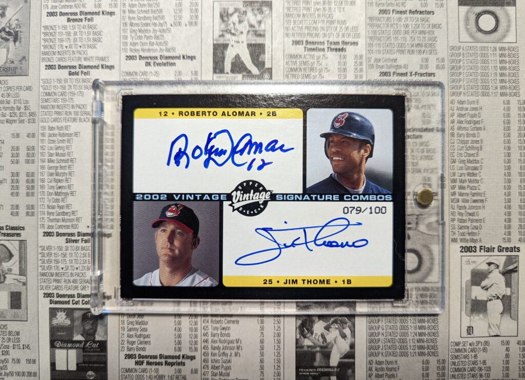Isn’t this a cool card? You can’t go wrong with a card signed by both Jim Thome and Roberto Alomar. The 2002 Upper Deck Vintage set is still, I think, one of the most attractive modern sets ever. It was a “vintage” set, but because Upper Deck cannot just copy its old designs as Topps does with its Heritage releases, they had to come up with an original theme for the set. And they pulled off a clean, retro-inspired design. The only real problem is that cards are black-bordered, so they are condition sensitive. They are also tough to come across, with only 100 printed.