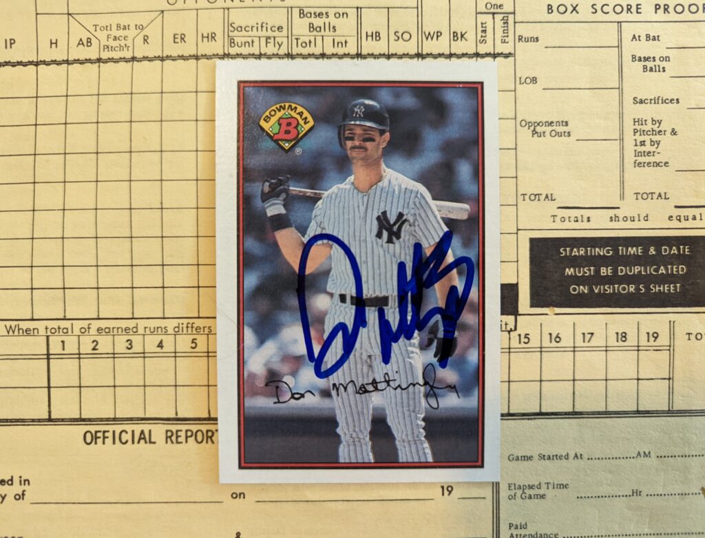 A couple of years ago I had the chance to get Mattingly in person. I have a complete 1989 Bowman set that my dad bought me when I was a kid, and decided to crack it open–maybe for the first time ever–to dig out the Mattingly card. I was lucky enough to get him with almost no trouble. I was happy, but nowhere near as thrilled as some of the Yankees fans who were there.