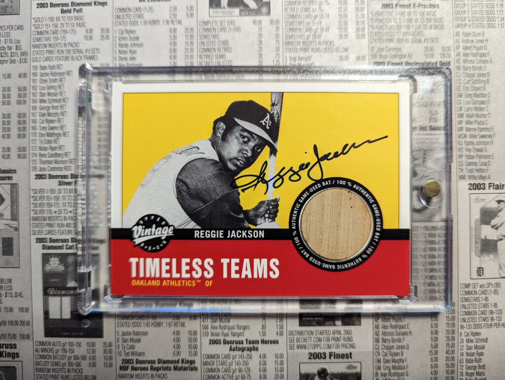I am a huge fan of those 1970s Oakland Athletics teams, and Reggie Jackson was the offensive heart of those clubs. He was also one of the first player’s autographs I ever got–in person, no less–when I got into autograph collecting back in 2002. Back then, as today, I still hate getting autographs in person, but there is no denying the thrill of being in a huge crowd trying to get a legendary player’s autograph…and getting it. That day sparked a passion for autograph collecting that lasts until this day.
