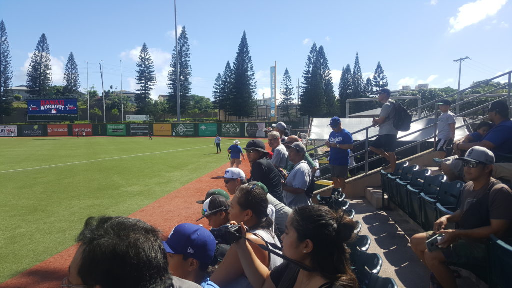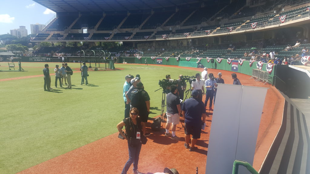 The coaches for the MLB team walked over, did interviews, and walked back. I guess it was a lighting issue. The University of Hawaii players were there.