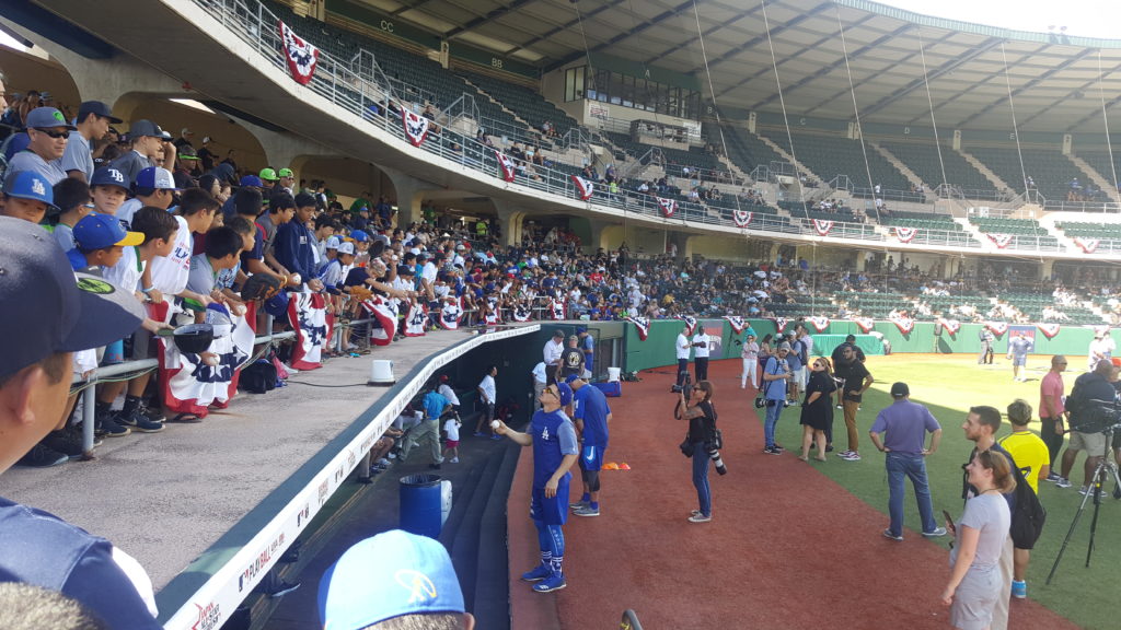 No idea who would be in which dugout. The Hawaii home clubhouse is nicer…assumed that is where the MLB players would be. At first, I thought this was the right choice. Media was set up in front of the dugout. Neat.