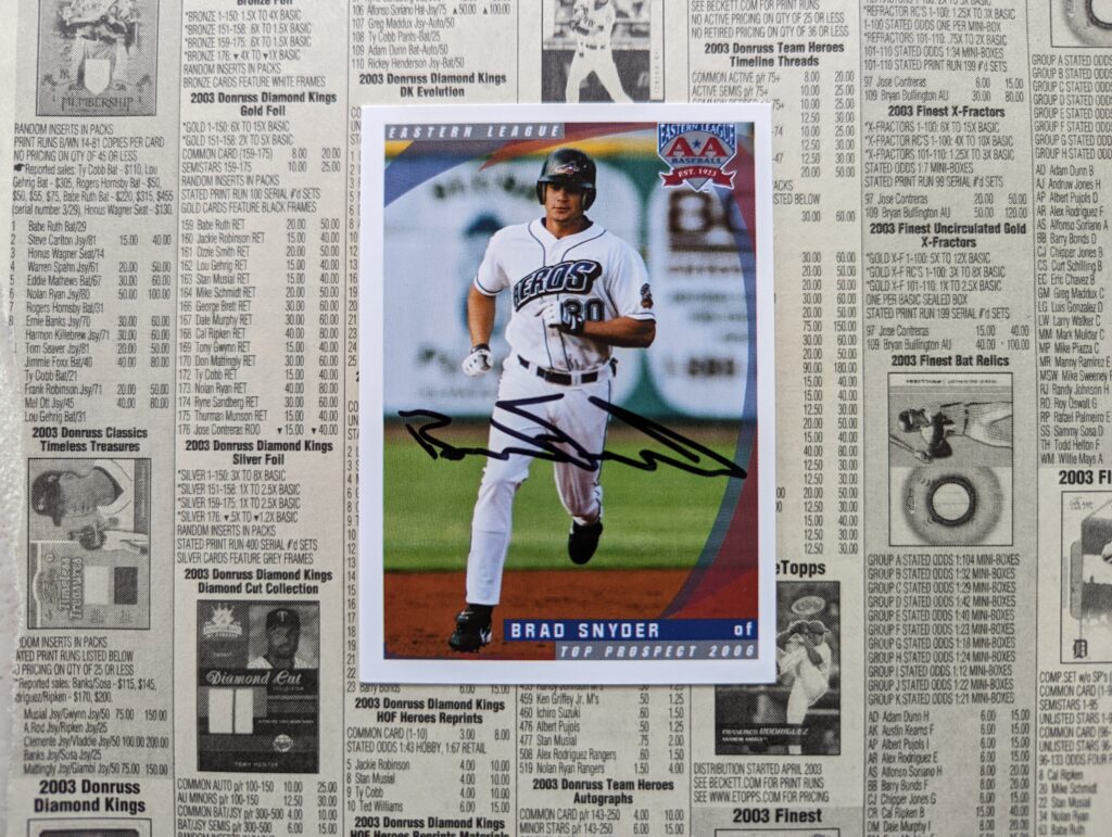 From 2004-2008 outfielder Brad Snyder was one of Cleveland’s best prospects, ranking as high as #3 in 2006. His power-speed combination had some people comparing him to Fred Lynn, which is a very high compliment. Unfortunately, strikeouts were a problem that dogged Snyder as he moved up through the minors, eroding his prospect status. Cleveland lost him on waivers to the Cubs in 2008. Snyder would eventually see a handful of at-bats over parts of three seasons with the Cubs and Rangers, but would ultimately become a 4A-type and retire following the 2017 season.