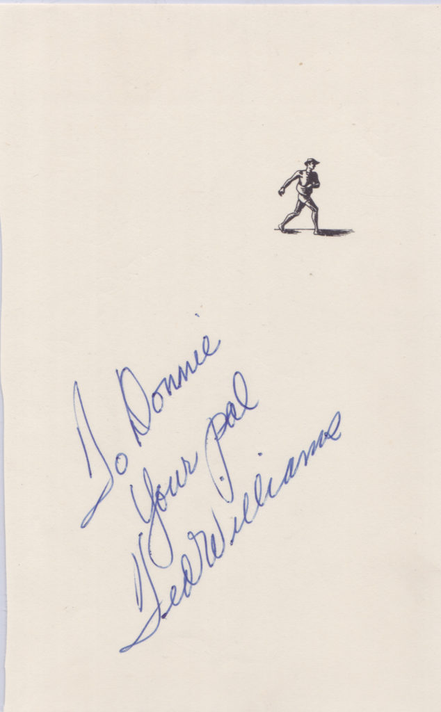 - It’s about as nice a Ted Williams signature you will find; bold blue ballpoint and no real significant smearing. I just love it. I had been wanting to buy this autograph forever, but the seller would not budge on the price until recently. I had some paypal, and moved quick. I think I got a good deal. I popped the page out of the book and dropped it in a top loader. It should keep well.