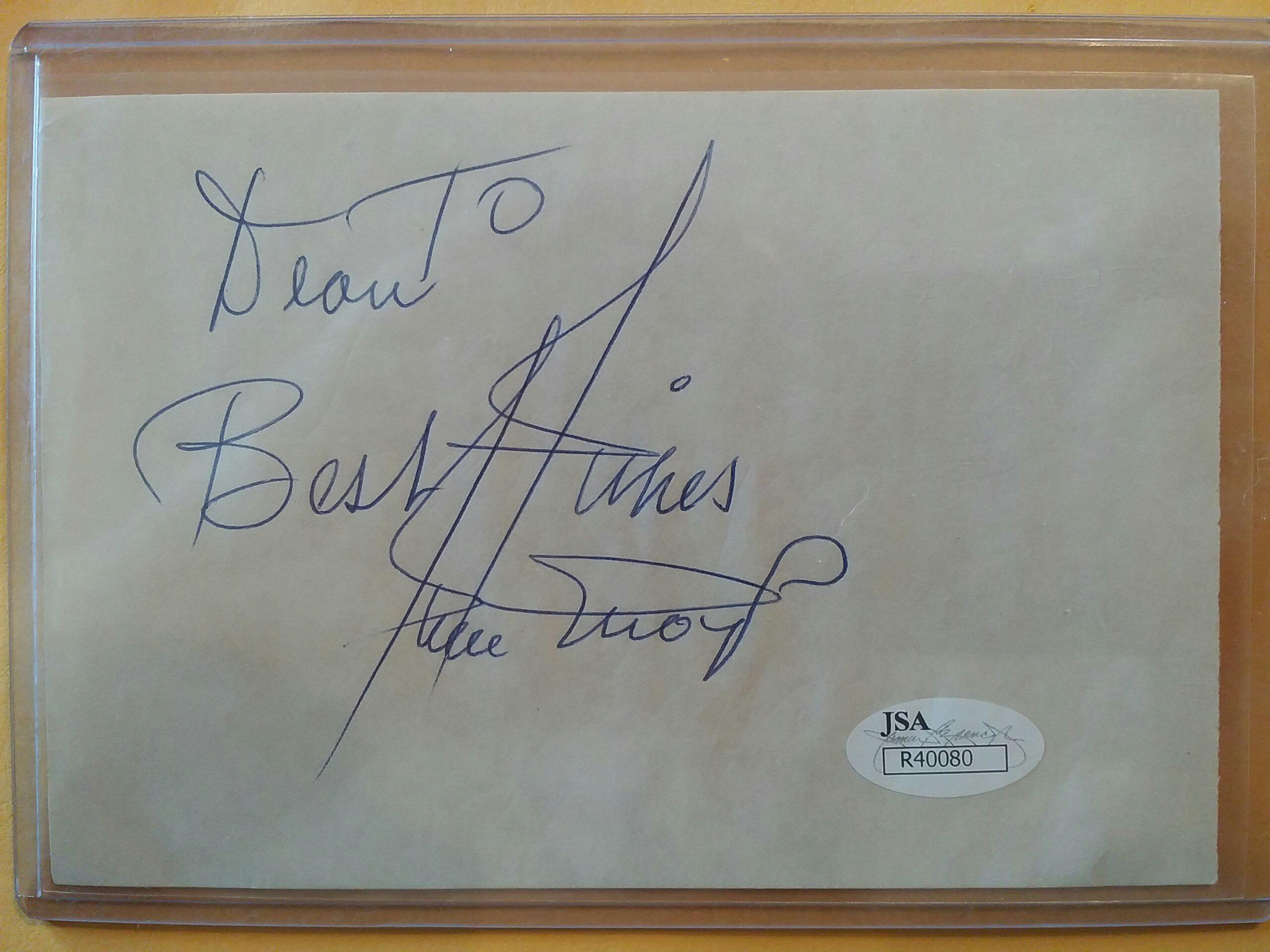 I really dig it. It’s in blue ballpoint pen, and bold. The best thing is that its old–it looks like its from the 1970’s–so that autograph it not going to bleed or fade much moving forward. The only possible problem with it was it was paper was clearly extracted from an autograph album, so there are some indentations of past autographs on the page. But it does not detract from the autograph at all.