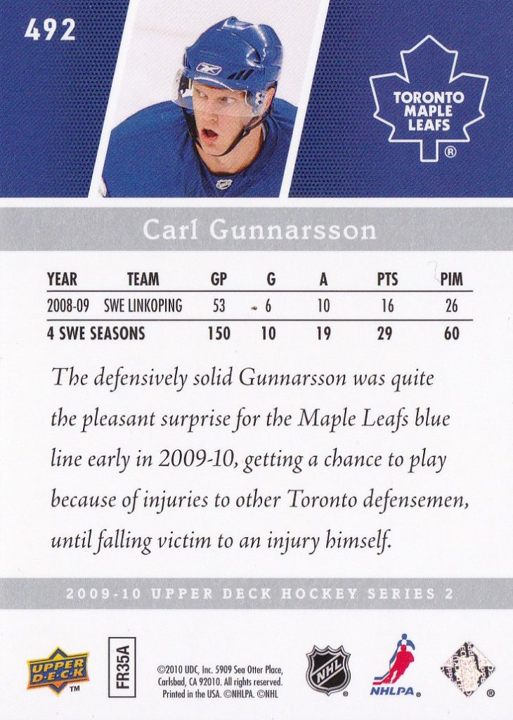 2009-10 Upper Deck #492 Carl Gunnarsson