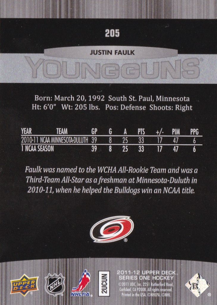 2011-12 Upper Deck #205 Justin Faulk (b)