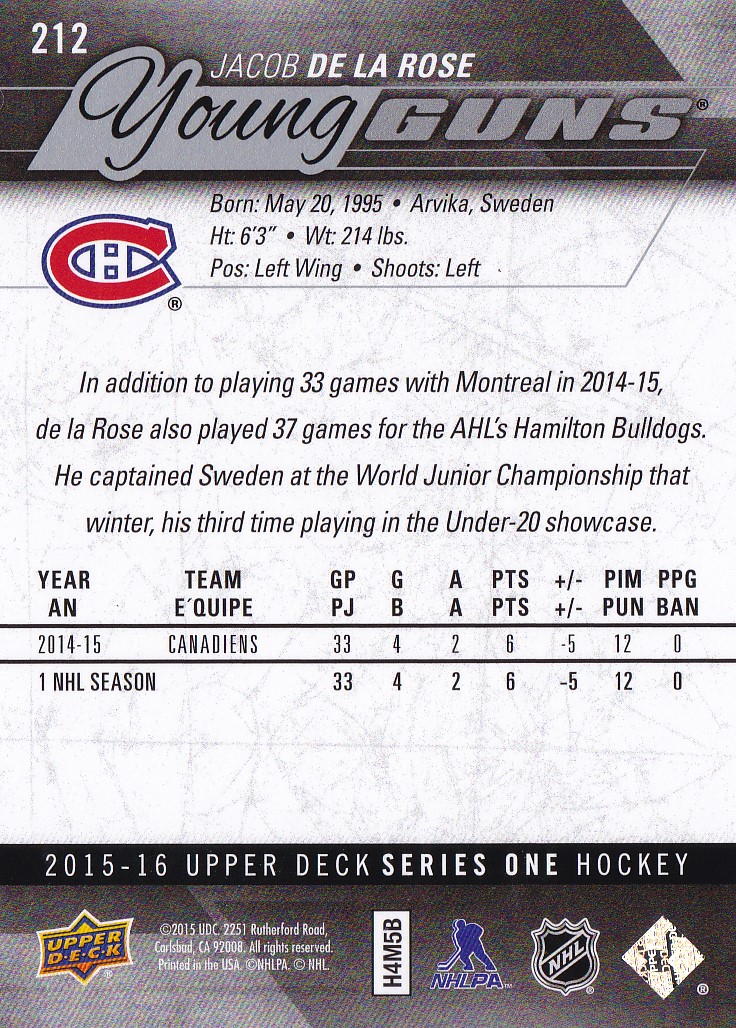 2015-16 Upper Deck #212 Jacob de la Rose