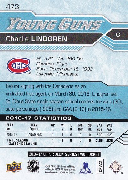 2016-17 Upper Deck #473 Charlie Lindgren