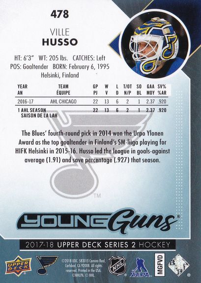 2017-18 Upper Deck #478 Ville Husso