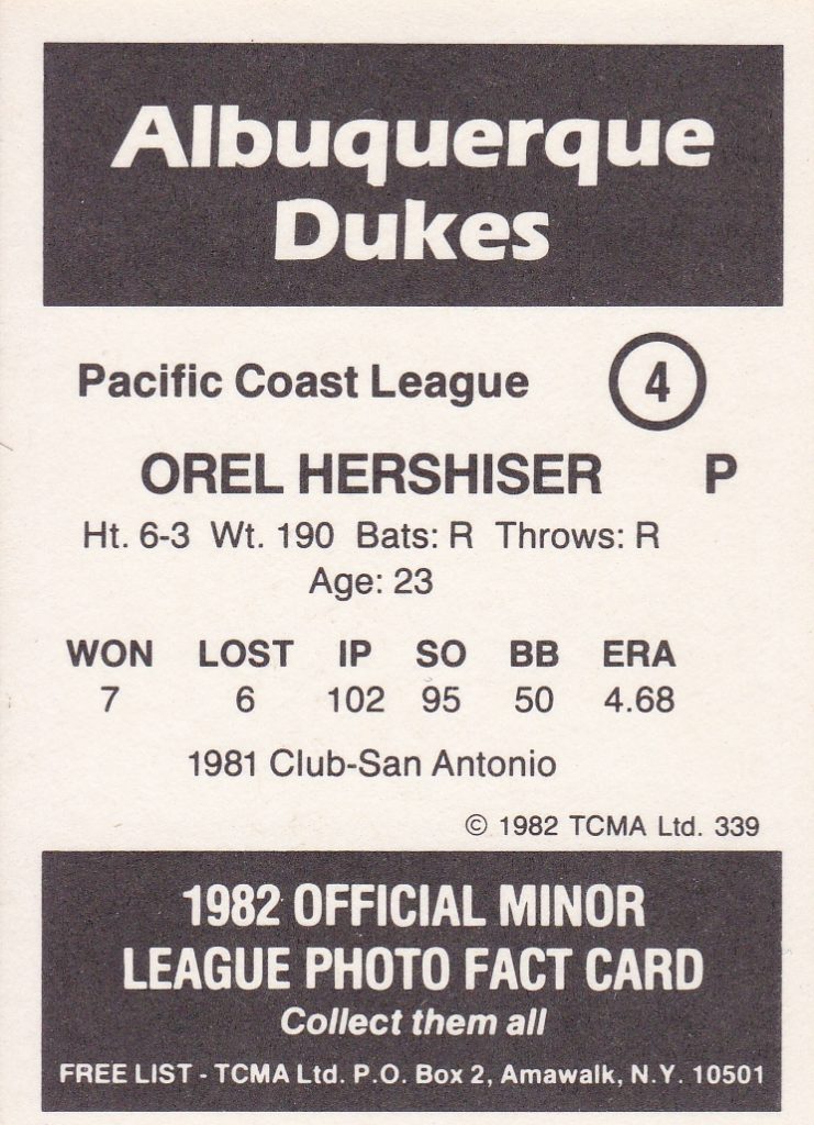 1982 TCMA Albuquerque Dukes #4 Orel Hershiser [b]