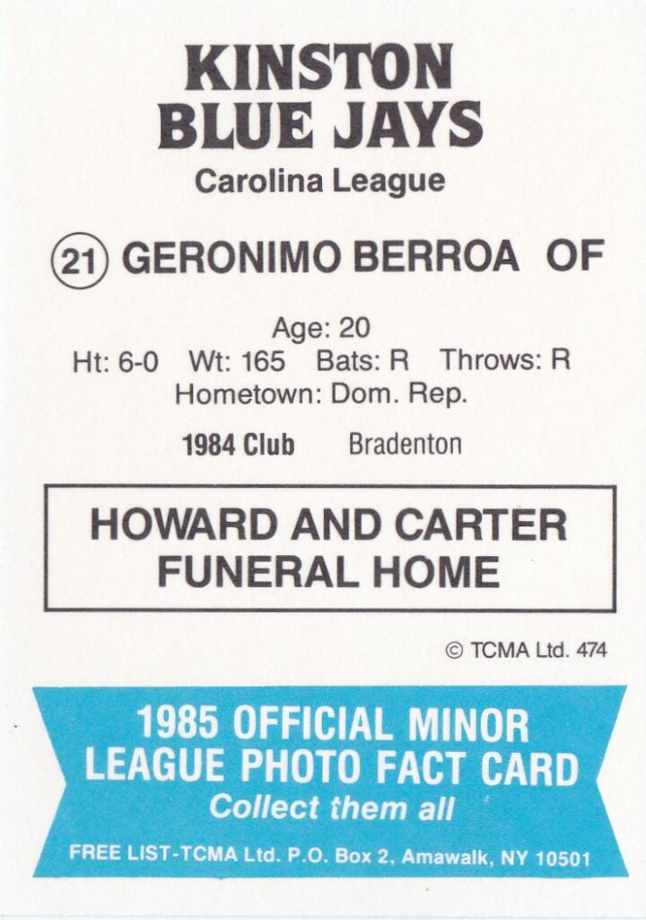 1985 TCMA Kinston Blue Jays #21 Geronimo Berroa
