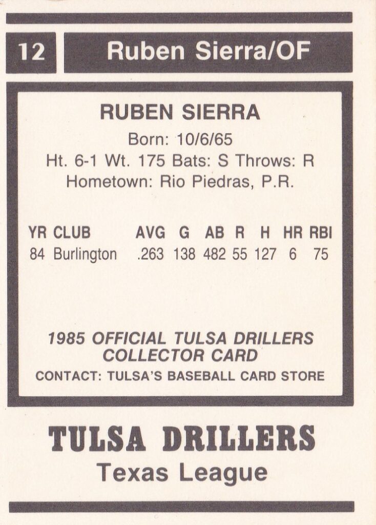 1985 Tulsa Drillers #12 Ruben Sierra