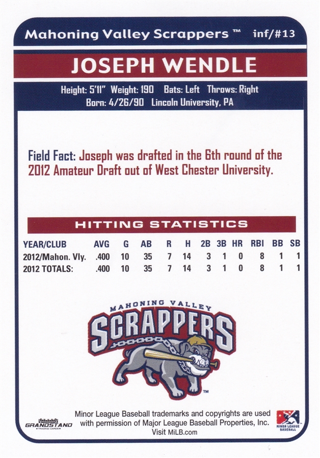 2013 Grandstand Mahoning Valley Scrappers Joey Wendle (b)
