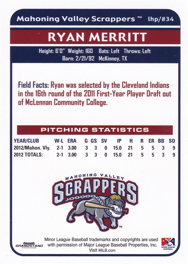 2013 Grandstand Mahoning Valley Scrappers Ryan Merrit (b)