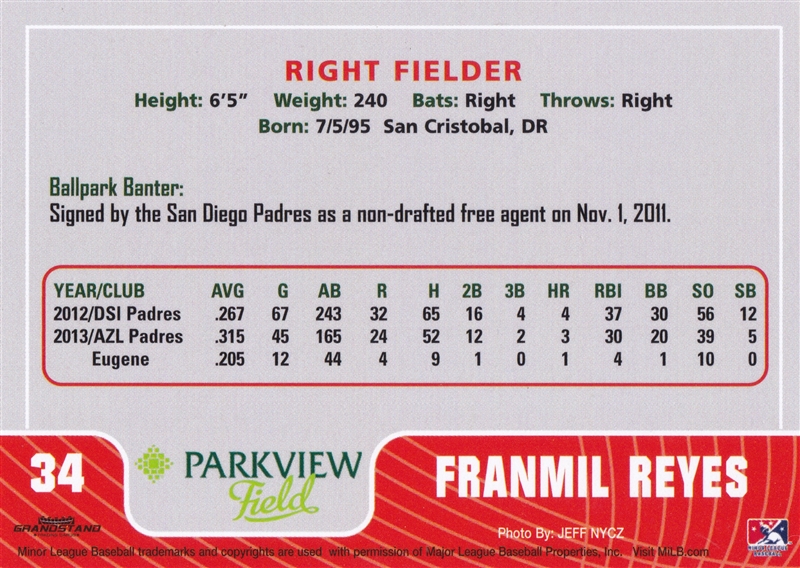 2014 Grandstand Fort Wayne Tincaps Franmil Reyes #34 (b)