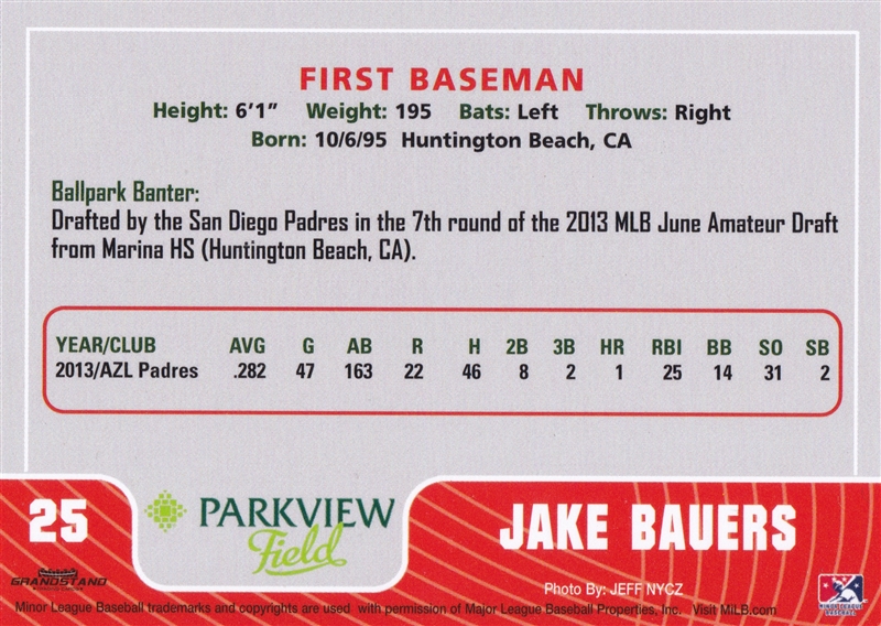 2014 Grandstand Fort Wayne Tincaps Jake Bauers #25