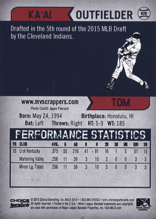 2015 Choice Mahoning Valley Scrappers #26 Ka’ai Tom (b)