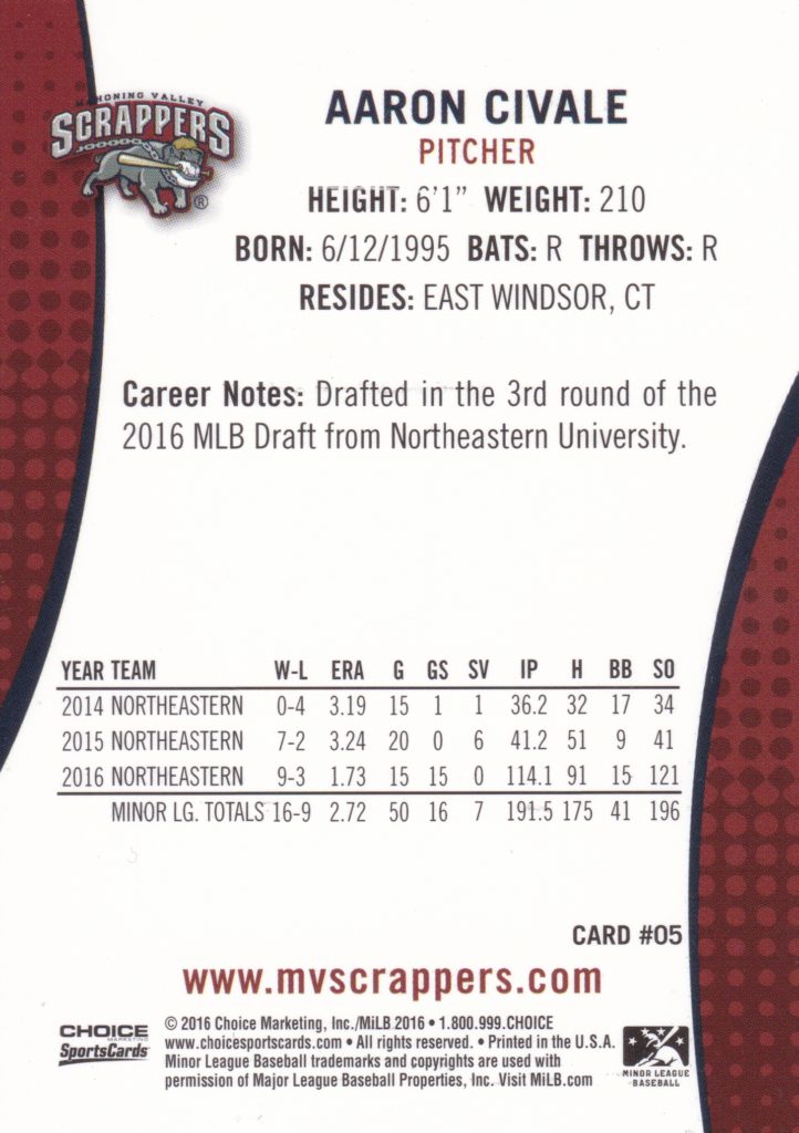 2016 Choice Mahoning Valley Scrappers Aaron Civale #5 (b)