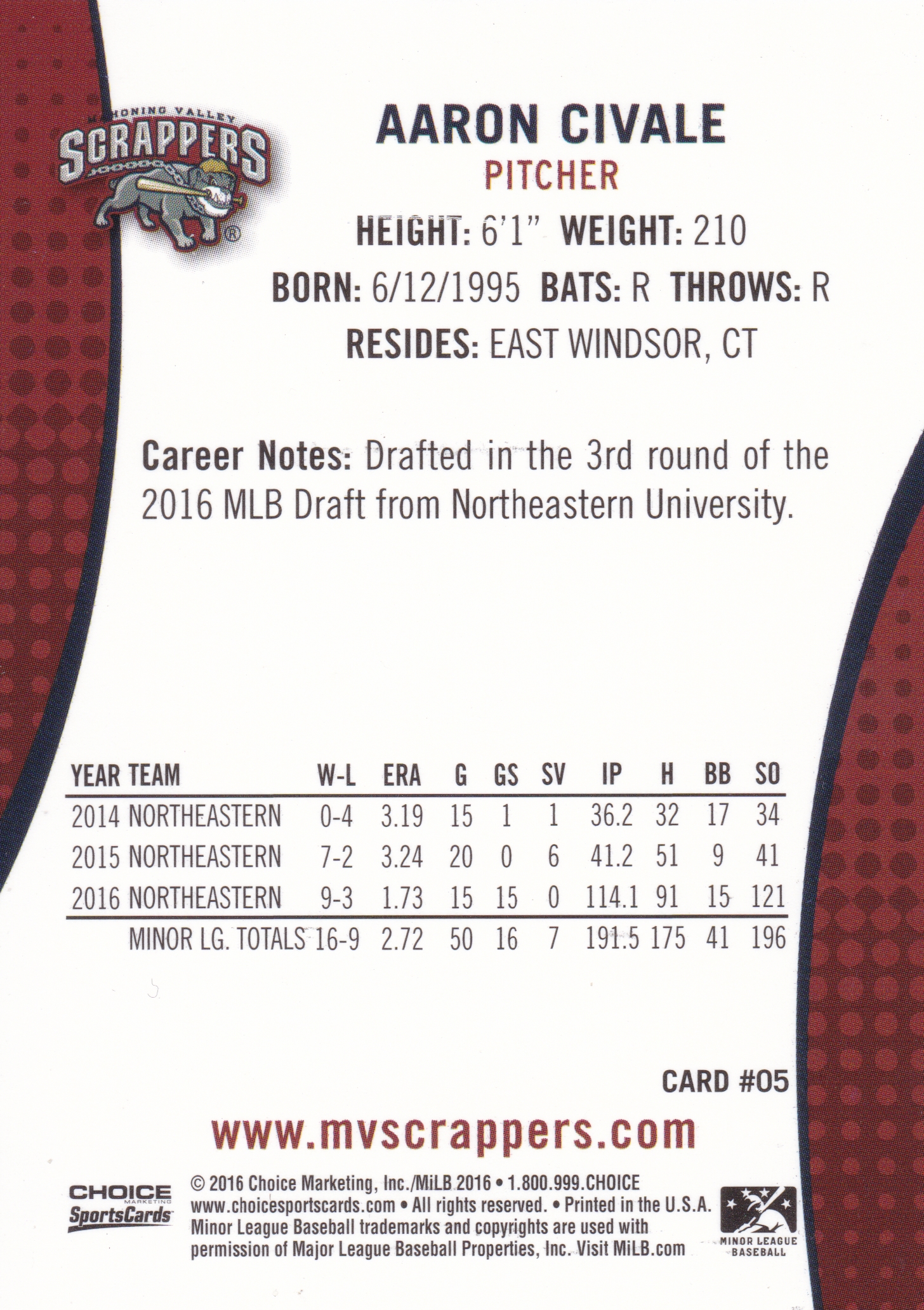 2016 Choice Mahoning Valley Scrappers Aaron Civale #5