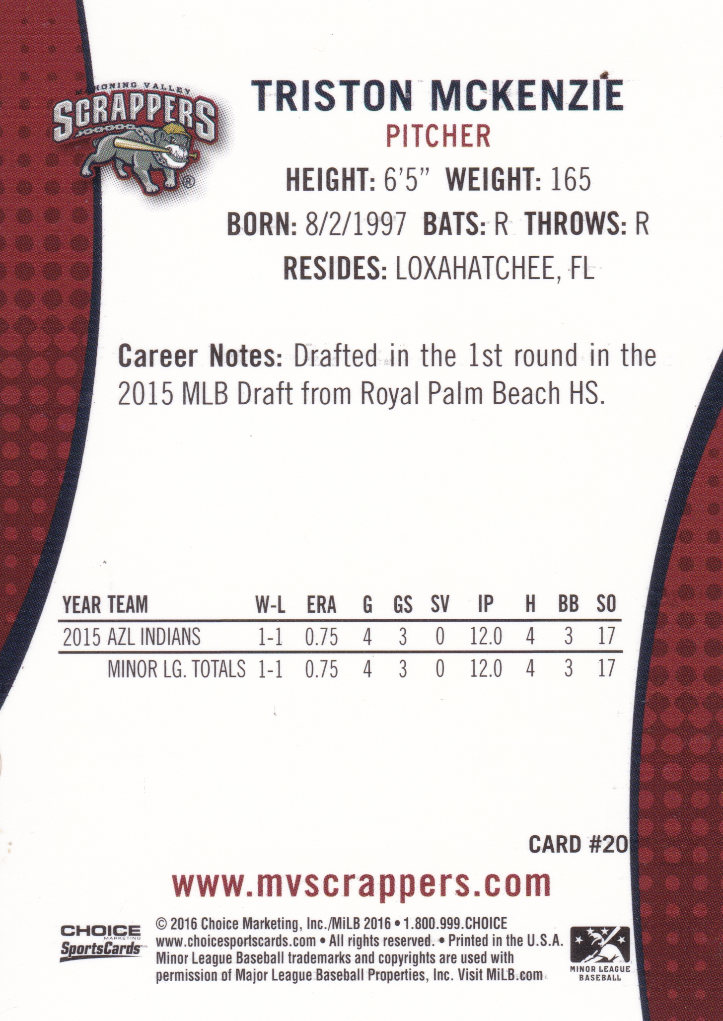 2016 Choice Mahoning Valley Scrappers Triston McKenzie #20 (b)