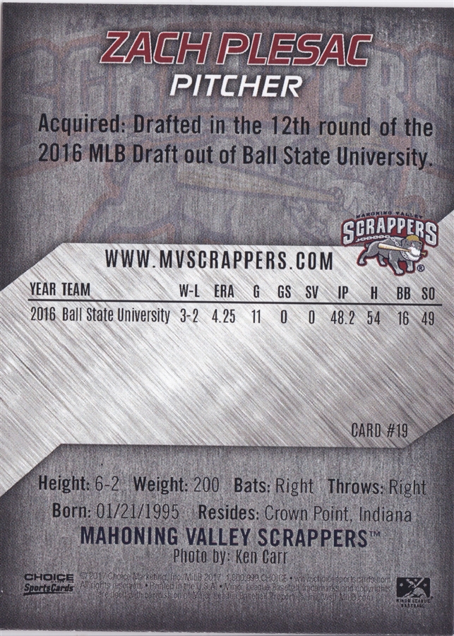 2017 Choice Mahoning Valley Scrappers Zach Plesac (b)