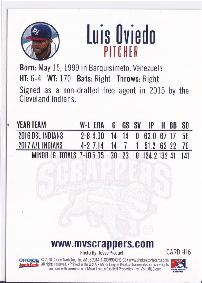 2018 Choice Mahoning Valley Scrappers Luis Oviedo (b)