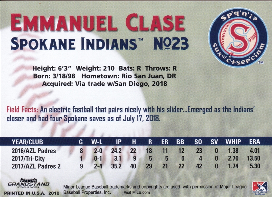 2018 Choice Spokane Indians #23 Emmanuel Clase (b)