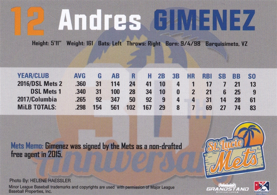 2018 Grandstand St. Lucie Mets Andres Gimenez (b)