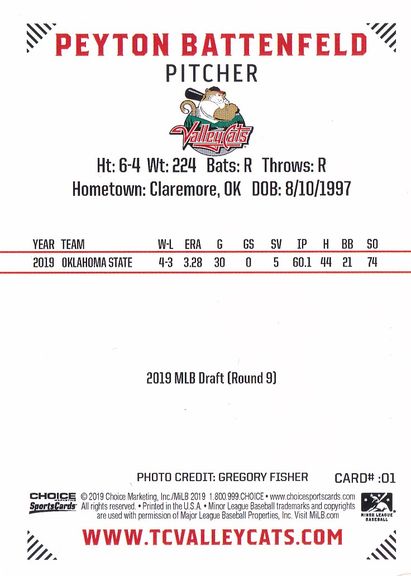 2019 Choice Tri-City Valleycats #01 Peyton Battenfield