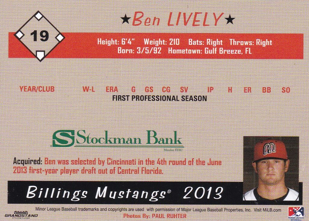 2013 Grandstand Billings Mustangs #19 Ben Lively (b)