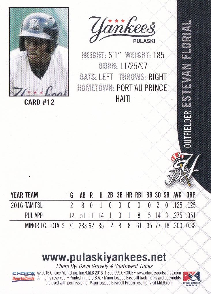 2016 Choise Pulaskiy Yankees #12 Estevan Florial [b]