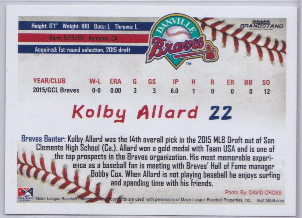 2016 Grandstand Danville Braves #22 Kolby Allard [b]