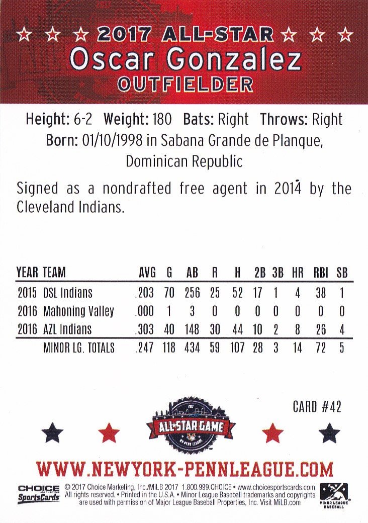 2017 Choice NY-Penn League All-Star #42 Oscar Gonzalez (b)