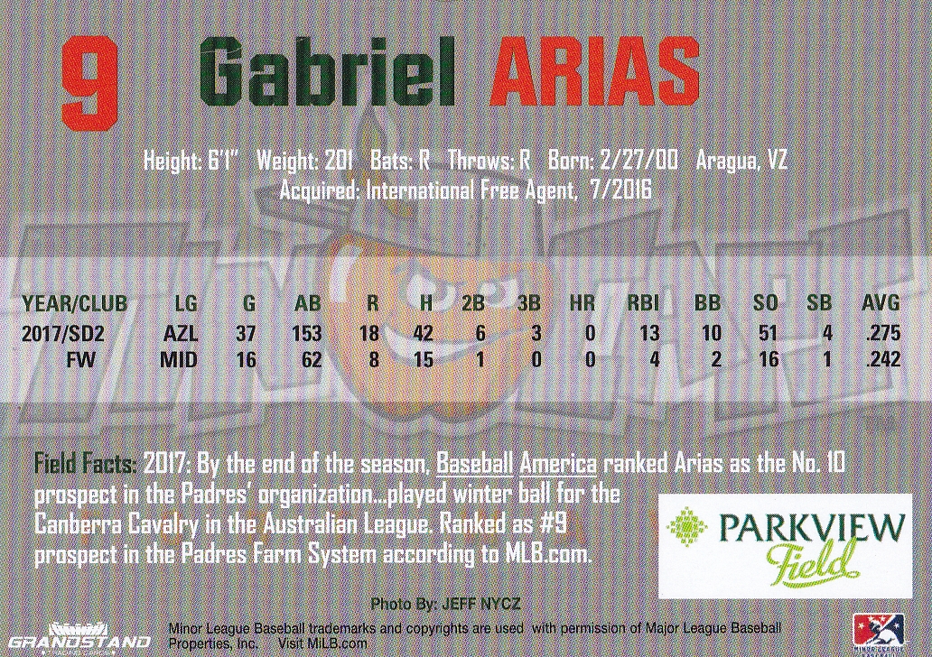 2018 Gabriel Arias Fort Wayne Tincaps #NNO Gabriel Arias [b]