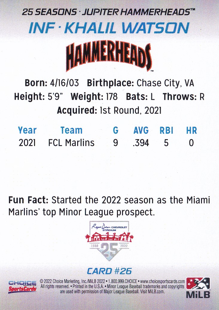 2022 Jupiter Hammerheads #26 Khalil Watson