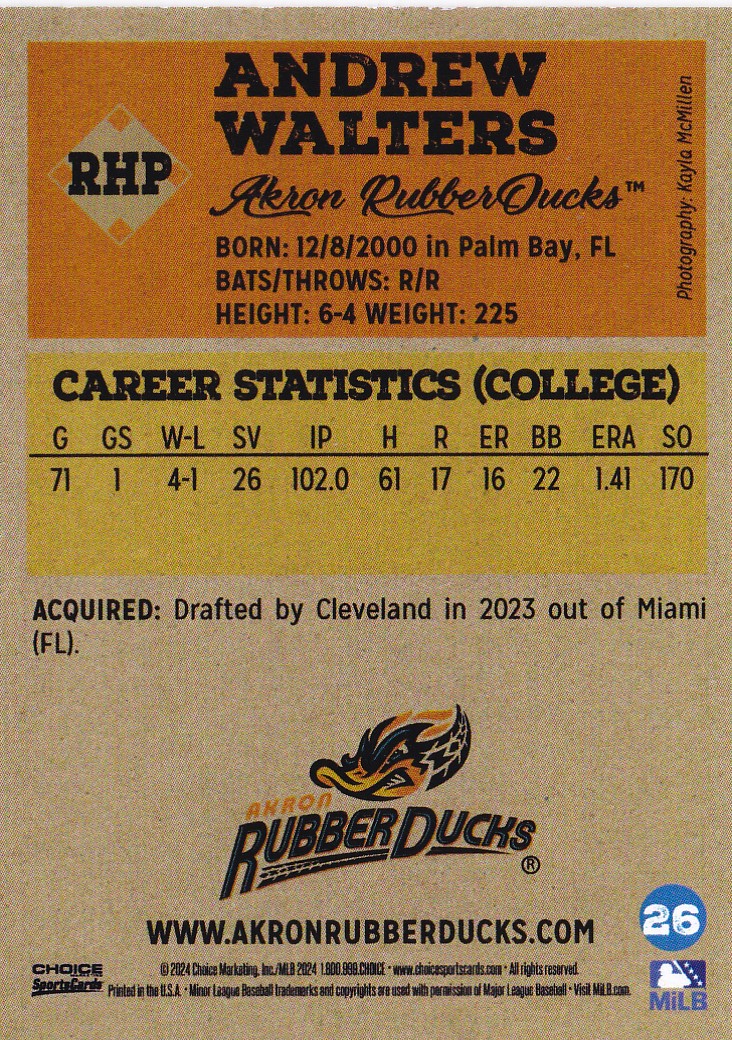 2024 Choice Akron Rubber Ducks #26 Andrew Walters (b)