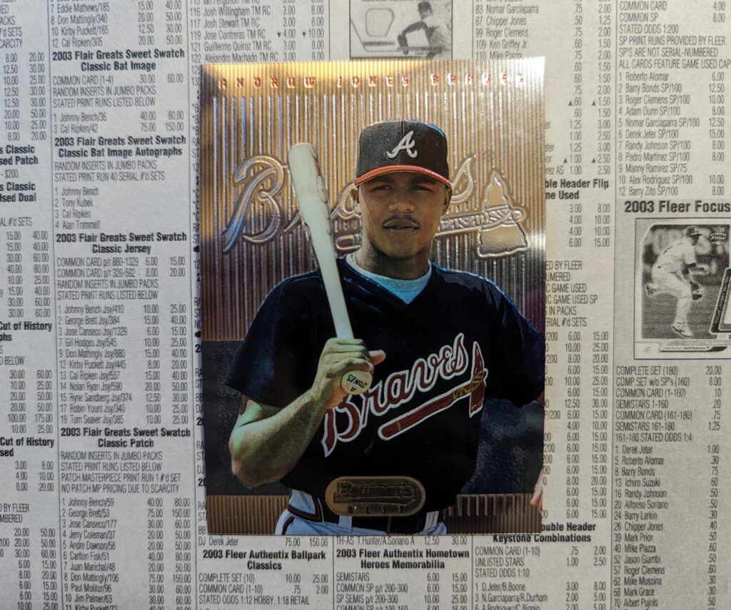 In July 2005 Beckett Baseball magazine published an All-Time Hot List, tracking the last nine years’ worth of Hot List cards and ranking them #1-#244. This card, 1995 Bowman Best Andruw Jones, was # 14 on that list. When this set came out, packs ran a pricey $5 each. But the line-up of rookie cards was impressive, including Bobby Abreu, Bartolo Colon, Scott Elarton, Juan Encarnacion, Vladimir Guerrero, Andruw Jones, Hideo Nomo, Rey Ordonez, Scott Rolen and Richie Sexson.